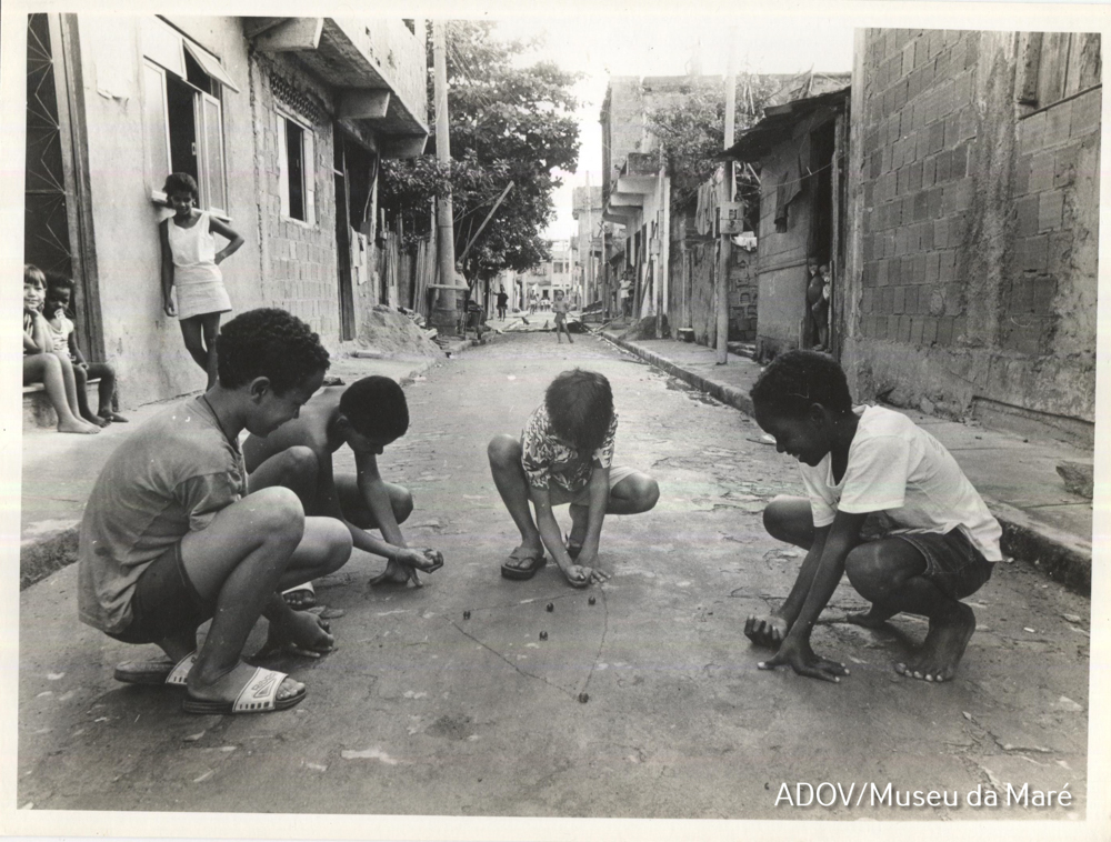 Imagem de 4 meninos jogando bolinha de gude no meio da rua. NO meio da imagem há um triangulo desenhado no chão com 5 bolas de gude dentro dele. Em volta dele há 4 meninos agachado, uma das mãos apoiada no chão com a outra segura uma bola de gude. Em 2 plano ni lado esquerdo há duas crinaças sentada nba porta de casa e ao lado delas há uma mulher em pé, ao fundo há casas de tijolos em ambos os lados da calçada.