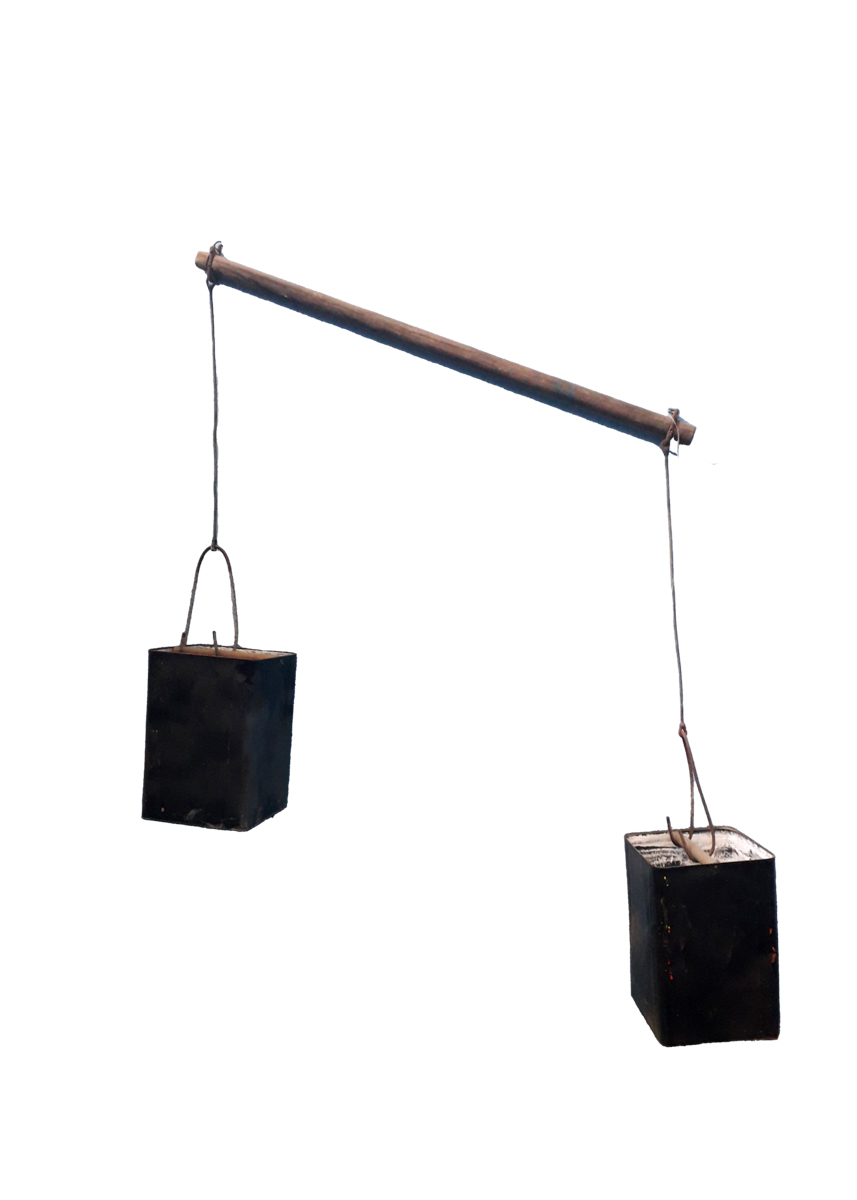 Devido ao precário abastecimento de água os moradores da Maré desenvolveram muitas estratégias, para o transporte de água eram utilizadas as balanças que eram formadas por um travessão com dois ganchos laterais onde eram colocadas latas d'água. A balança era equilibrada nas costas de quem a transportava. O objeto da exposição é original e feito em madeira e ferro.