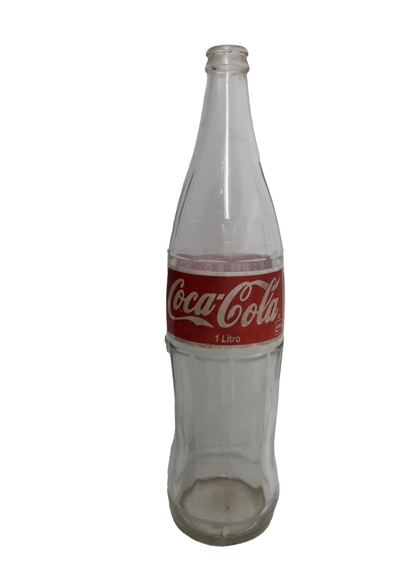 Garrafa de refrigerante da marca Coca Cola. Recipiente de vidro transparente, utilizado no comércio de bebidas. A garrafa contem um litro e o rótulo é de papel vermelho.